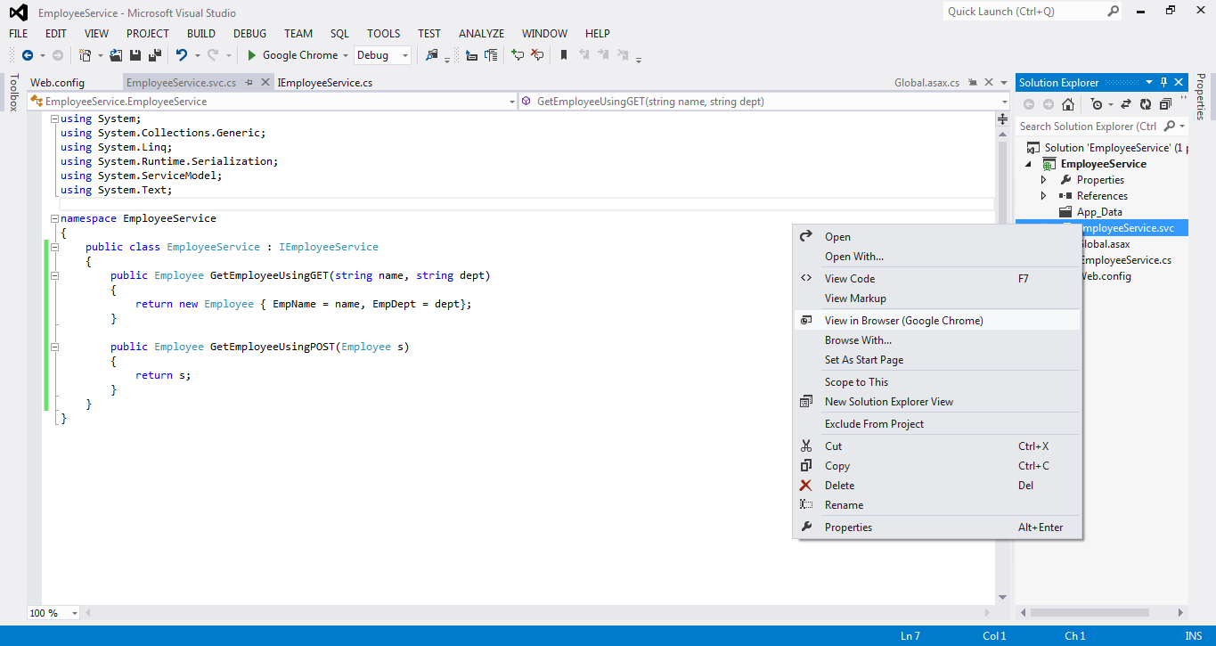 Once you've successfully built your project, right click the EmployeeService.svc file and select the View in Browser option.